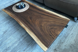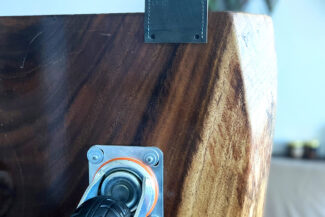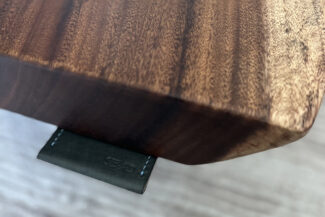 This sleek coffee table rides low to the ground and made of a solid slab of Walnut timber with a matte lacquer finish. Industrial grade, rubber caster wheels make it easy to move around for flexibility and the locking brakes make sure it doesn’t move when you don’t want it to. The STE-AD brand tag is made of hand-stitched genuine leather and can be customized upon request.