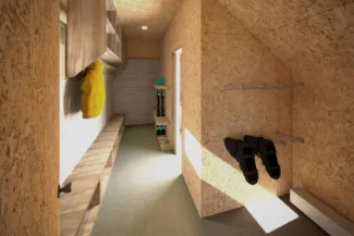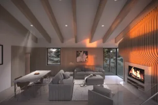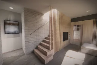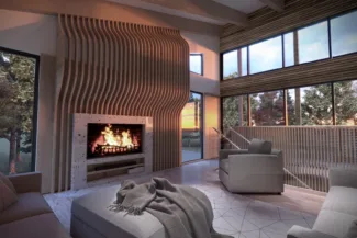 The second-floor living room is focused on a fireplace with a hearth leading up to a feature wall made of CNC-milled plywood. CNC-milled panels line the walls that will be prone to damage over the years.
