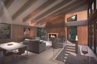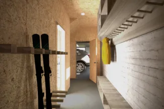 The home consists of 2 living rooms, a kitchen, 3 bedrooms, 2.5 bathrooms, a snow room, a garage, and a storage loft. The exterior balcony is intended to be used for outdoor grilling and hosting guests by extending the L2 living room to the exterior.