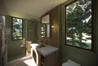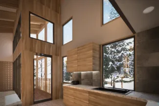 The Client for Sasayaki Matsu requested a house of similar design to that of Hibiki House. We reviewed the site, layout, and the Client’s brief and revised the design to suit. The fact that Niseko gets a large amount of snowfall was the main driving factor in the site orientation and building shape. The northerly winds from Mount Yotei dictated the angle of the roof so as not to allow snow to push upward against the accumulation on the inclined roof. Snow-shedding is the second factor in the placement of the down-slope of the roof. Several meters can accumulate and therefore the large volume of snow needs to be managed adjacent to the building.