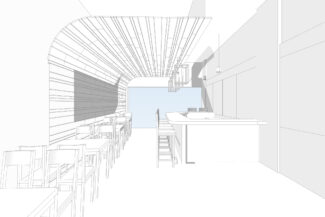The feature wall is designed to emulate the logo and font to reiterate the branding and create a sense of space without taking up any of the precious floor space. Inset lighting along the extruded half-moon shape lights the space and drawings attention from the street.