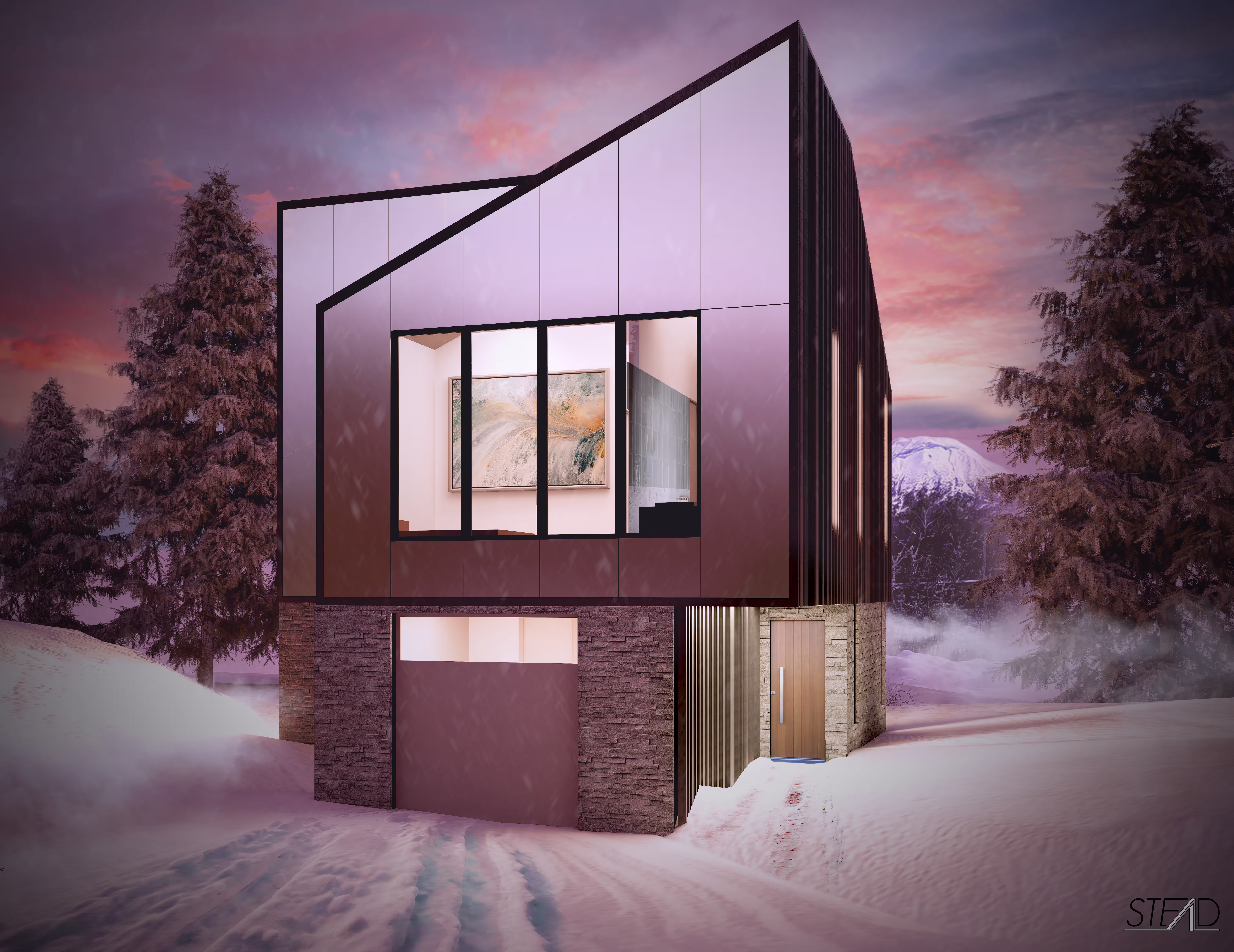 The form of this build went through several iterations to overcome the issue of large amount of snow shedding on a small site footprint. The L-shaped layout allows the snow to be safely shed onto the site by splitting it into two directions, both avoiding the garage and entrance. Construction is set to begin in the Fall of 2024.