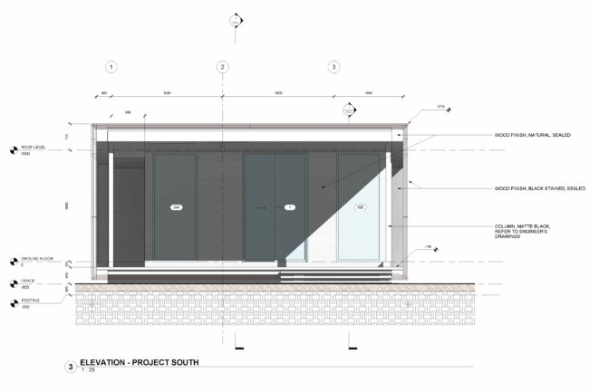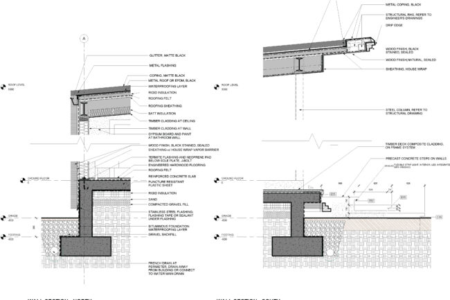 Timber cornices are subtly stepped outward to create a thin, planar edge profile, lending the building a lightweight visual character. This detailing softens the massing and reinforces the horizontal lines of the structure.