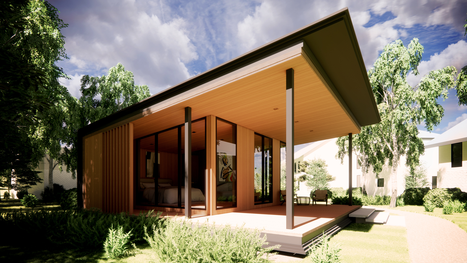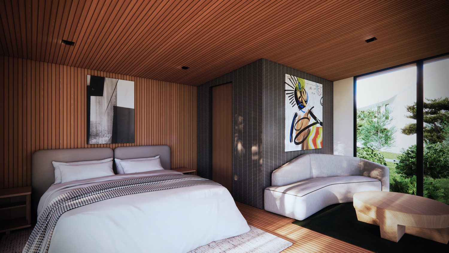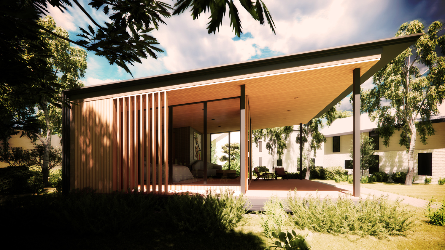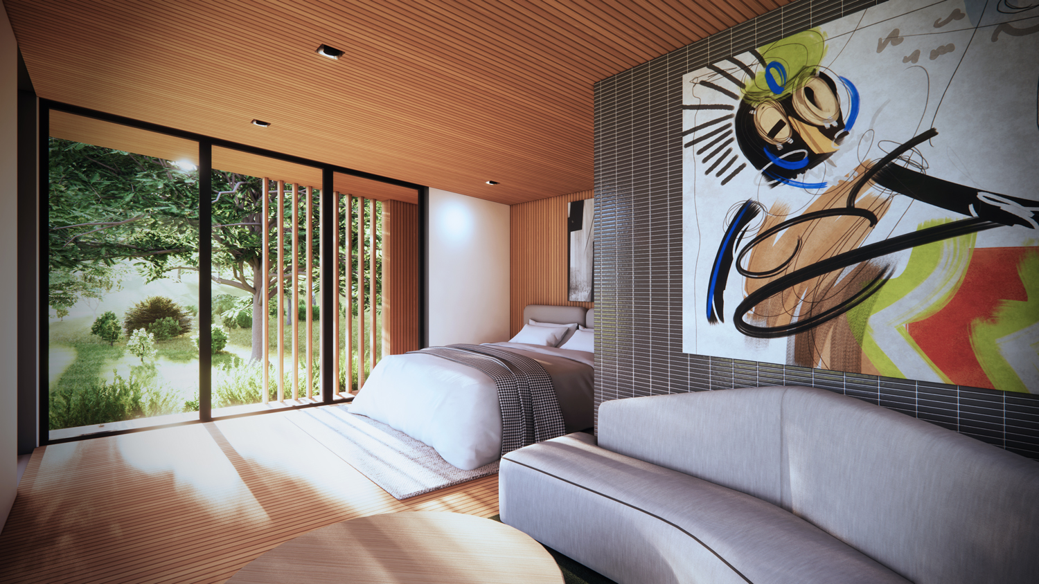 The brief called for a single-bedroom layout with an en-suite bathroom, along with both interior and exterior sitting areas. These spaces were designed to offer privacy while maintaining a connection to the outdoors.