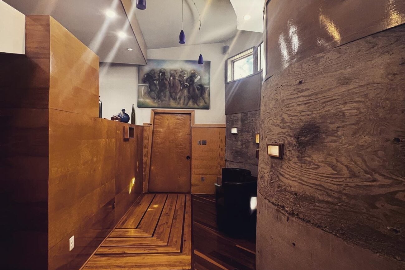 Dry Creek Cabin 的蛇形混凝土特色墙的灵感来自古老的马场围栏,这些围栏使用锯齿形配置来保持稳定性。