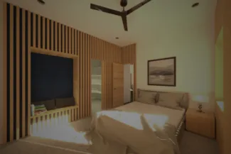 The timber-clad ceiling planes are folded like an origami crane, or airplane, and are propped up by two inclined walls finished with Jolypate textured render.
