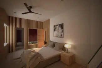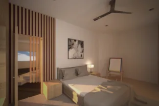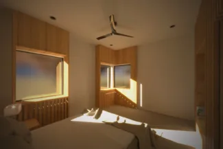 Between these inclined feature walls lies the main entrance on the ground floor where a snow room, two ensuite bedrooms, and a utility room are located. The entrance contains a foyer with a Japanese Garden and a staircase leading up to the L1 living space with a balcony, flanked by the dining room, living room, and master bedroom. A bridge connected to an existing structure allows for easy passage during heavy snow without having to go outside.