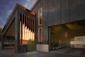 The client requested a communal gathering space at the entrance of the shed. We designed a covered entrance that reiterates the lines of the roof but also provides protection from the weather. The sides are left open, with copper-clad fins standing side by side to create a kaleidoscopic effect of nature and sunlight bouncing off one another to create an interesting ambiance.